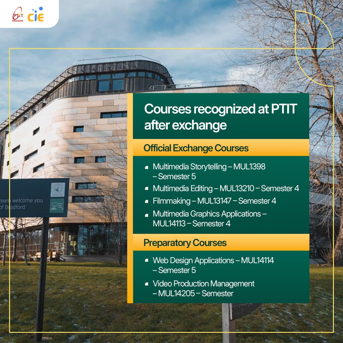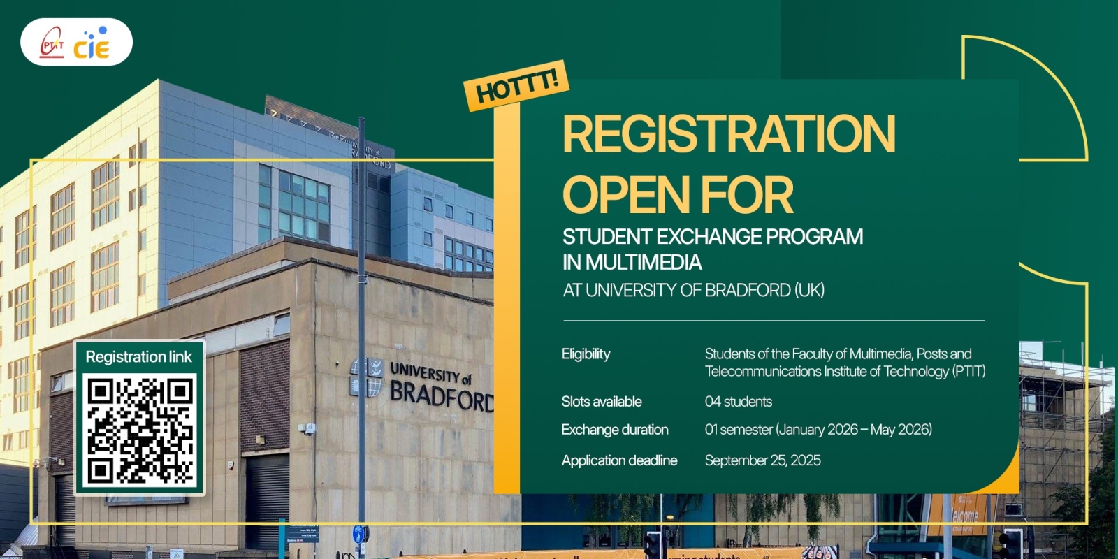Posts and Telecommunications Institute of Technology (PTIT) is proud to announce a student exchange program at the University of Bradford (UoB), United Kingdom, exclusively for students from the Faculty of Multimedia. This initiative is part of PTIT’s ongoing efforts to expand international learning opportunities, enhance academic quality, and provide students with the chance to experience a modern academic environment while applying their professional knowledge to practical projects.