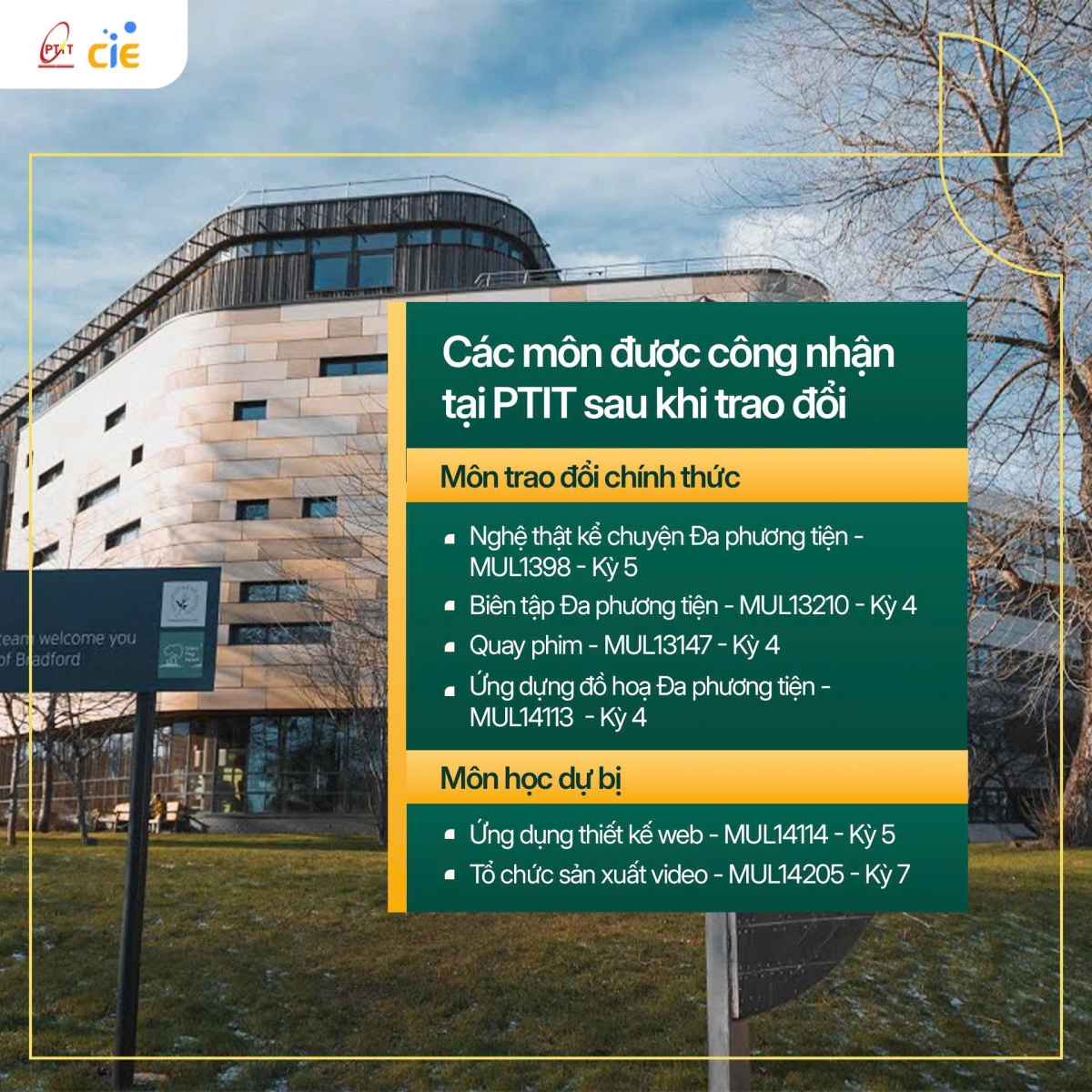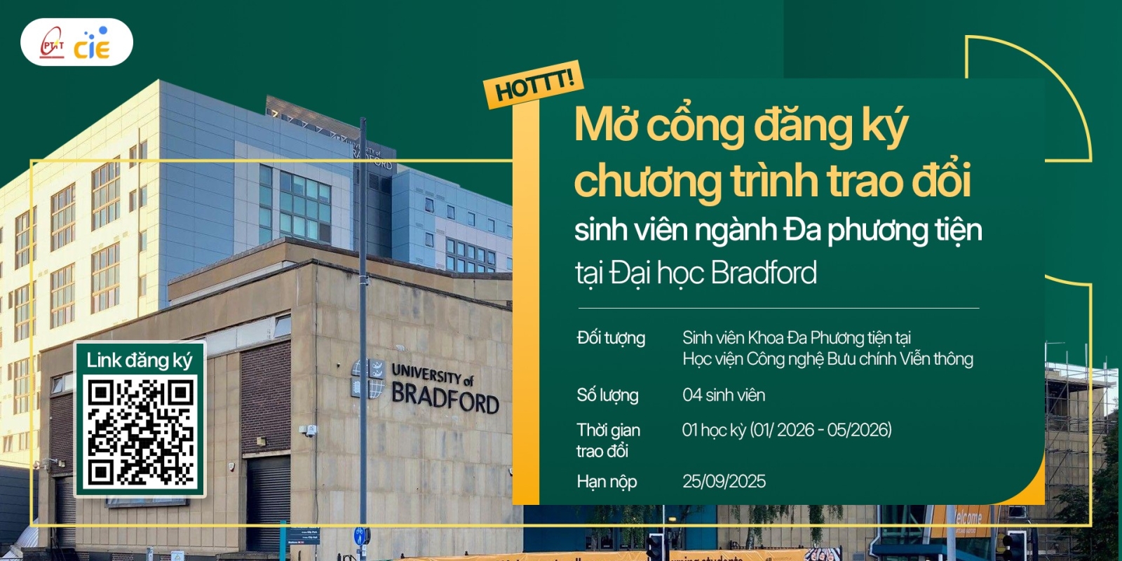 Học viện Công nghệ Bưu chính Viễn thông (PTIT) tự hào thông báo chương trình trao đổi sinh viên tại Đại học Bradford (UoB), Vương quốc Anh, dành riêng cho sinh viên Khoa Đa phương tiện. Đây là một trong những nỗ lực quan trọng của PTIT nhằm mở rộng cơ hội học tập quốc tế, nâng cao chất lượng đào tạo, đồng thời tạo điều kiện để sinh viên trải nghiệm môi trường học thuật hiện đại, áp dụng kiến thức chuyên môn vào các dự án thực tiễn.